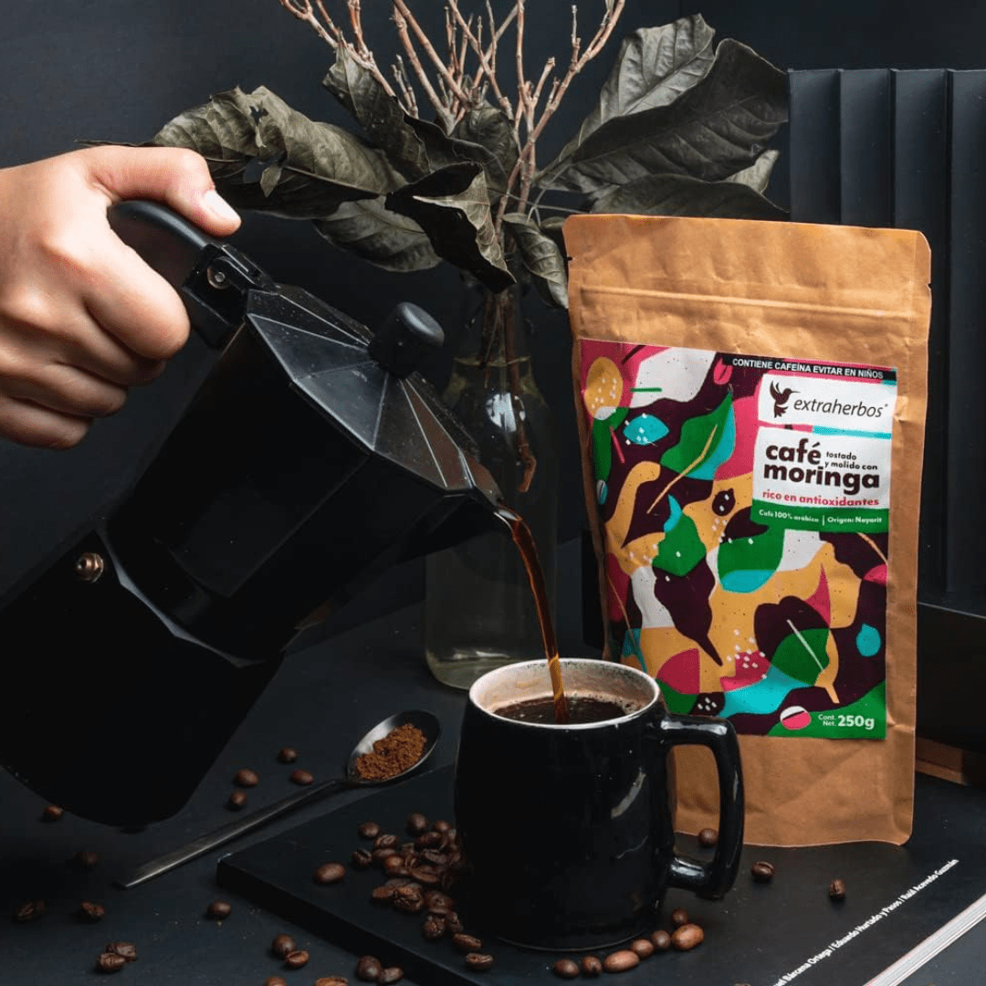Reinventa tu ritual mañanero con el Café con Moringa para Cafetera de Extraherbos. Este café, enriquecido con el polvo de hoja de moringa, procedente del icónico árbol de Moringa oleifera del Himalaya, te brinda no sólo un sabor extraordinario sino también un poderoso cóctel nutritivo.