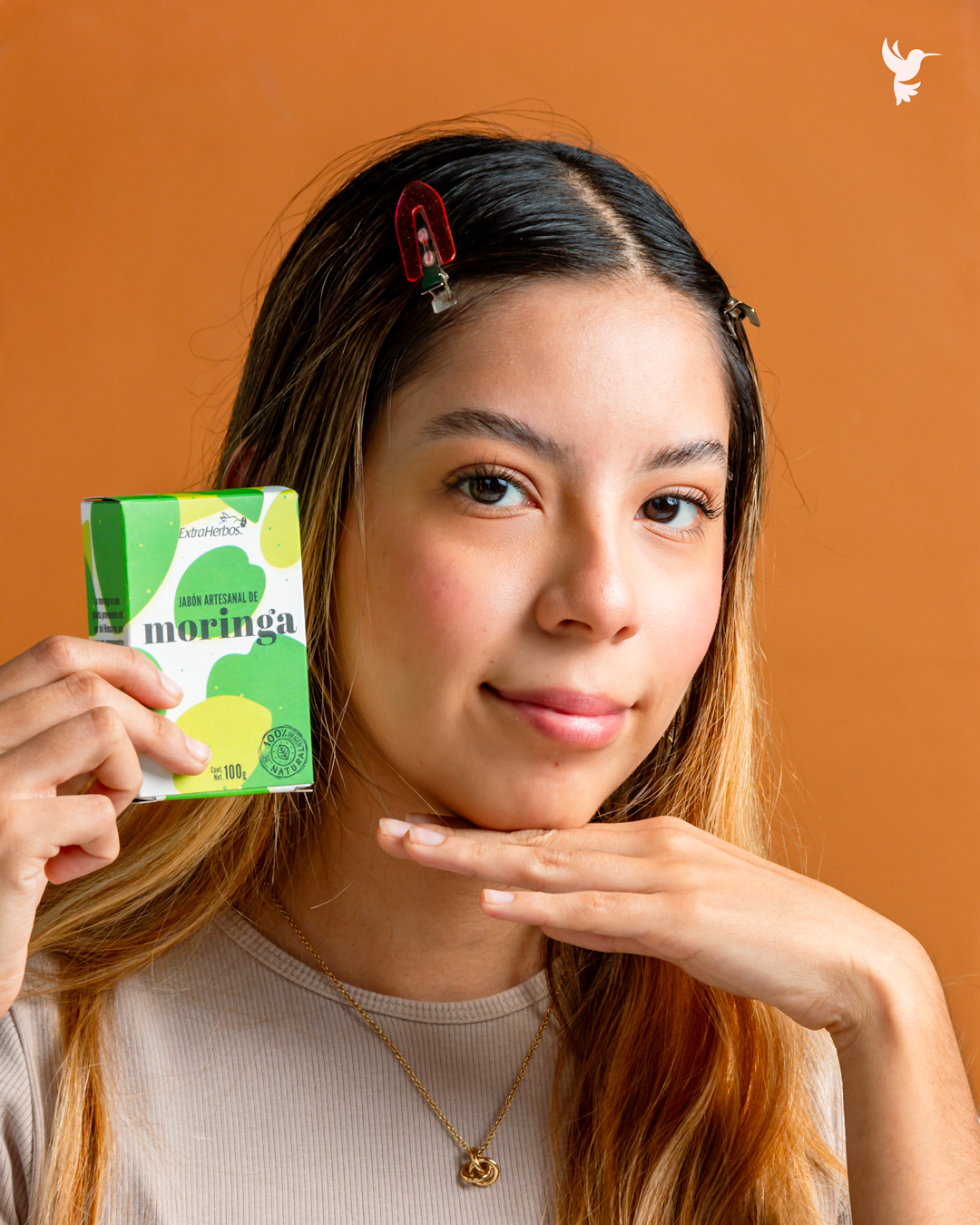 Ingredientes: Aceites saponificados de: coco (Cocos nucifera), semilla de girasol (Helianthus annus), palma (Elaeis guineesis), aceite, hoja molida y extracto de hoja de moringa (Moringa oleifera)