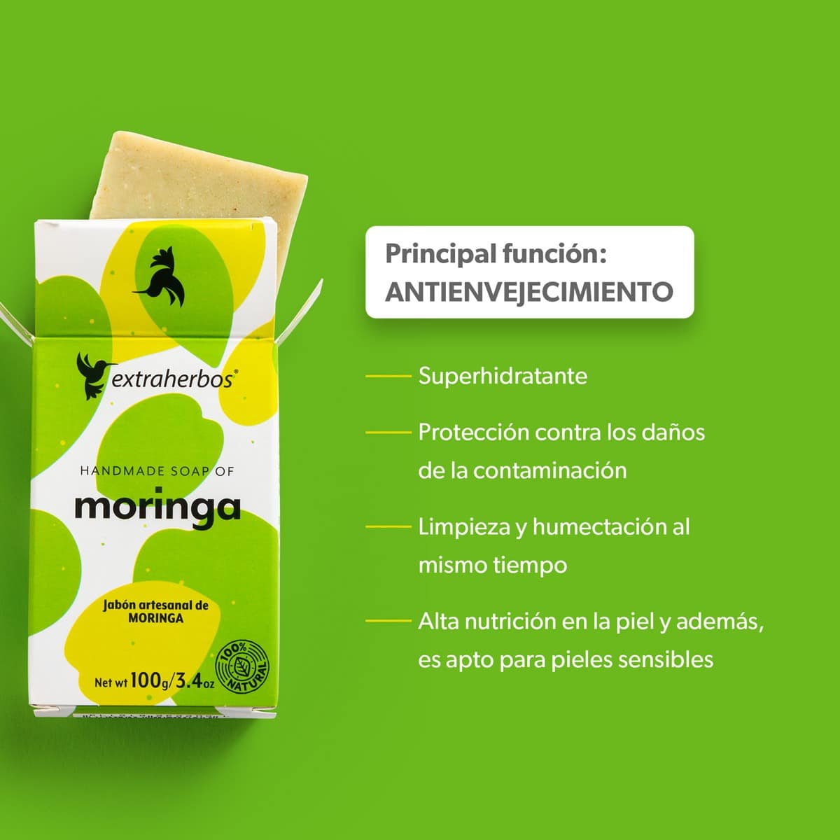 Redefine el cuidado natural de tu piel con el poder revitalizante de la Moringa. Este jabón artesanal no sólo te ofrece limpieza, sino una potente barrera protectora contra los daños de la contaminación.